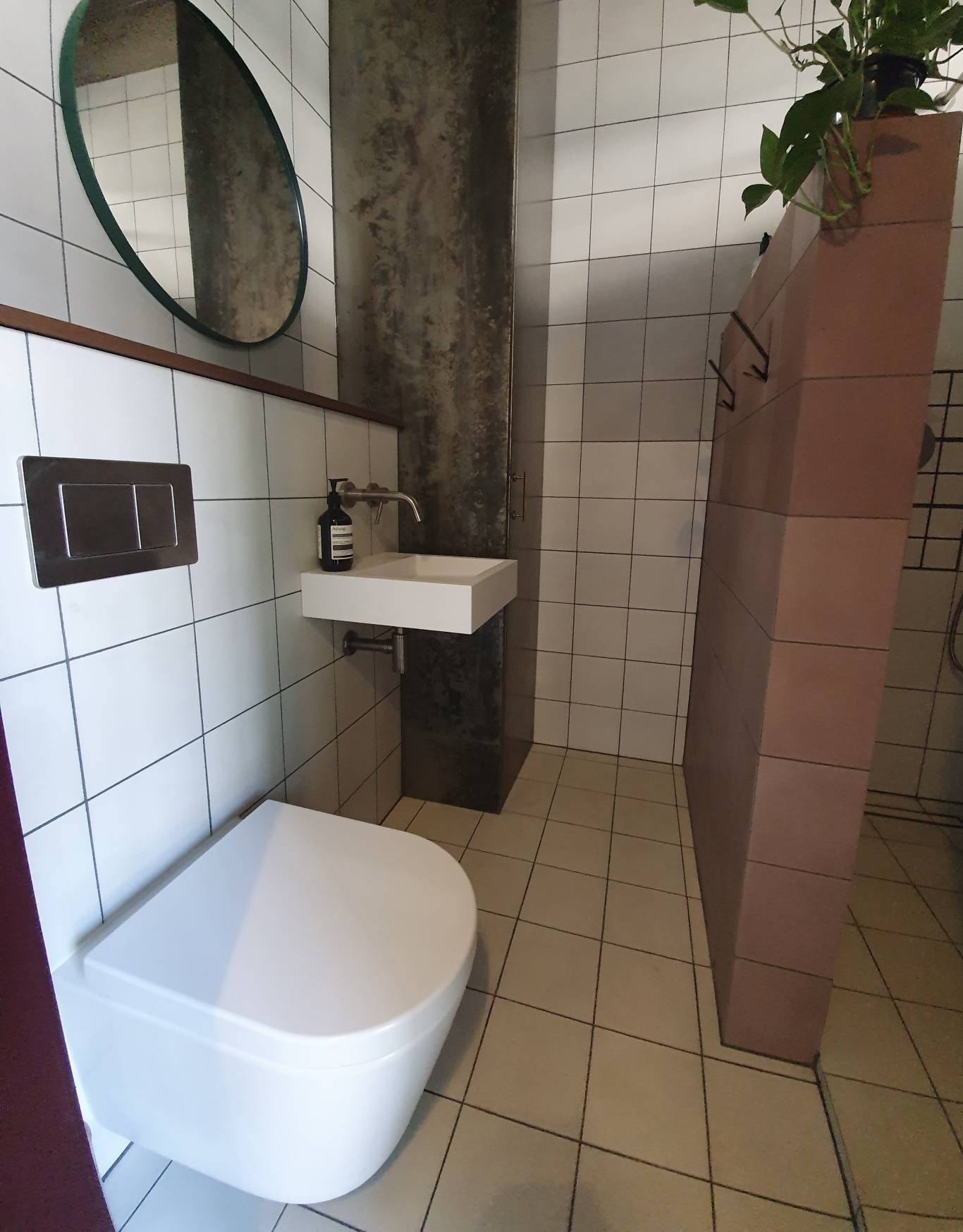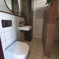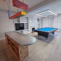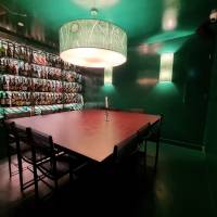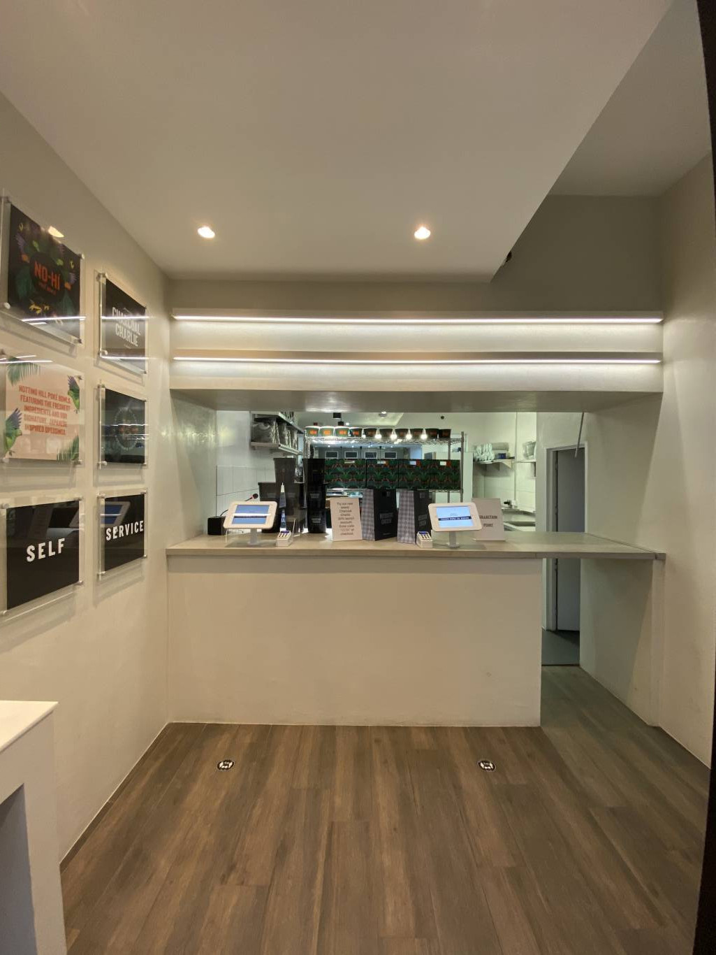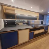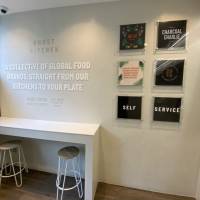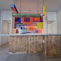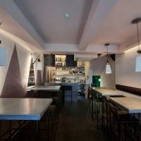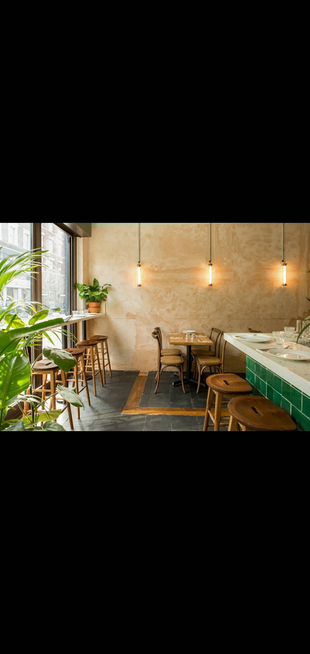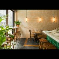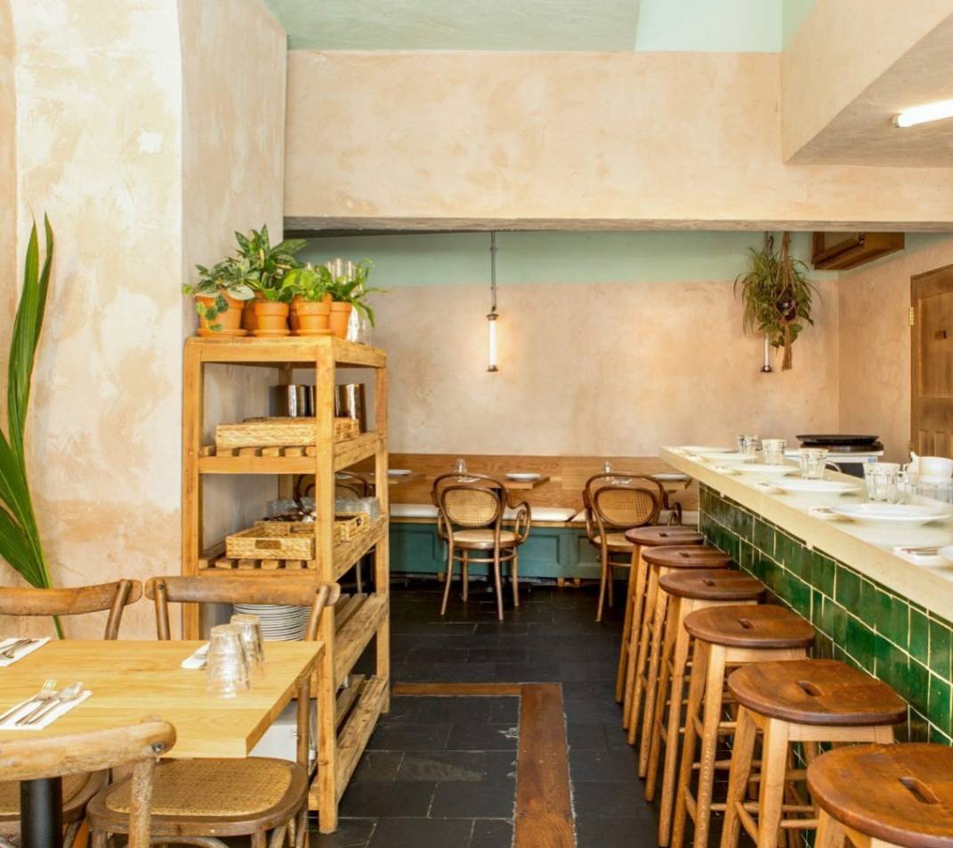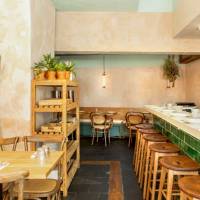 Newly refurbished vegan restaurant, refurbishment made by using sustainable and recycled products such as hand made tiles and recycled paper worktop.